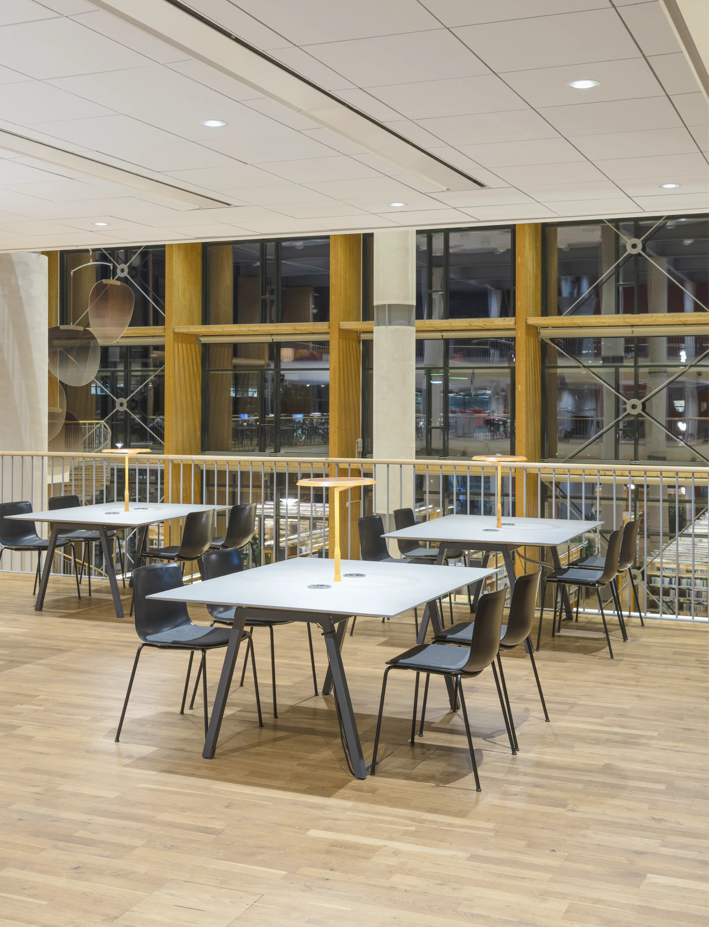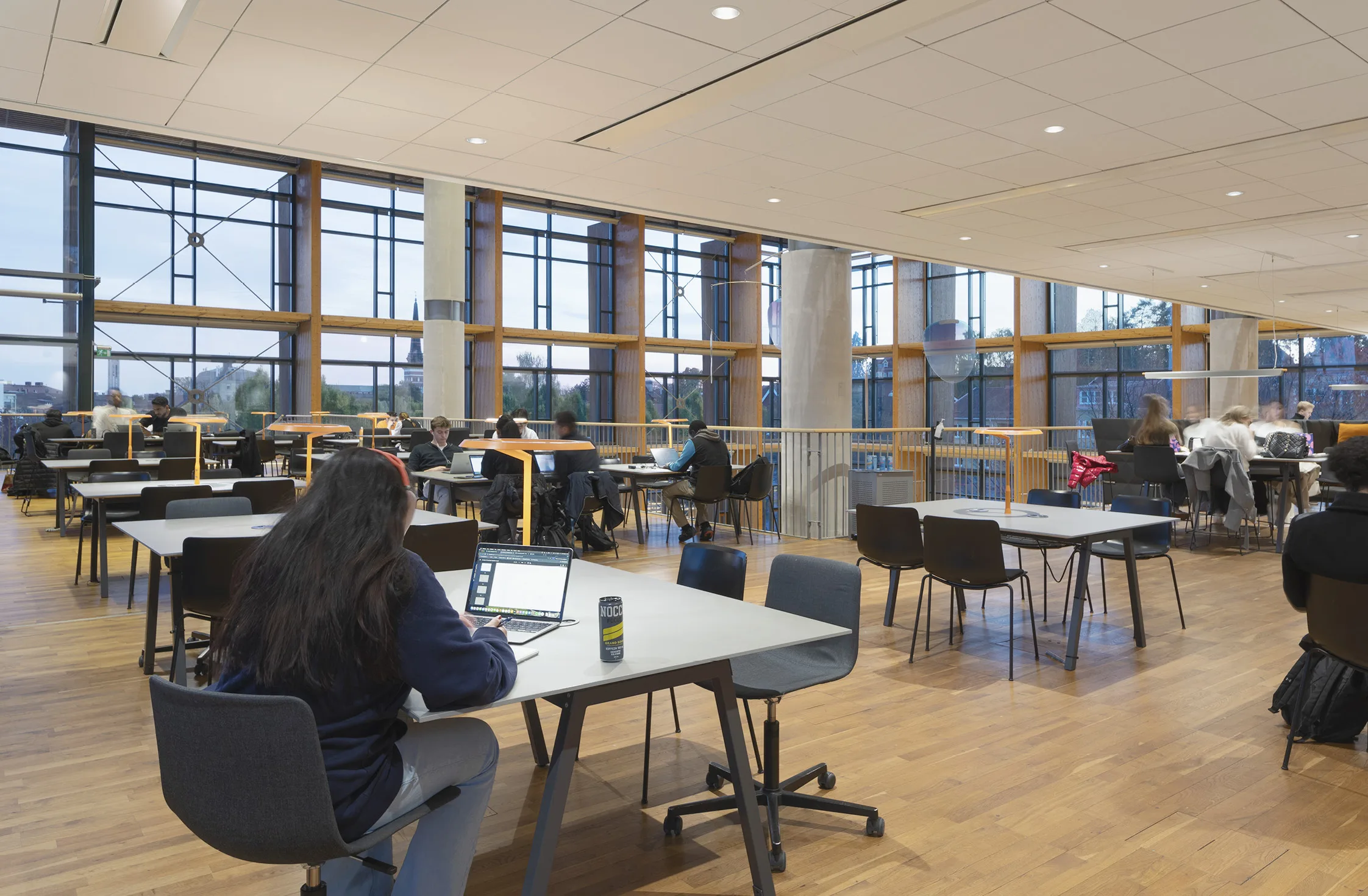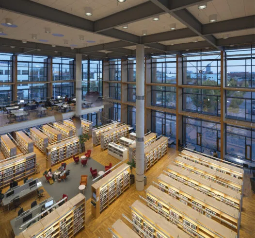 – Biblioteksbyggnaden ska kännas som en helhet, både när rummet upplevs inifrån men även när byggnaden ses utifrån. Och vi ville arbeta med alla typer av platser i byggnaden; från trappor och atrium till de cirka 375 studieplatserna och loungemiljöerna, säger Isabel ­Villar. Konceptet bygger också på att den varma interiöra belysningen smälter ut genom den glasade fasaden och ger ett mjukt, lika varmt ljus på dess vertikala träelement och den exteriöra miljön närmast fasaden.