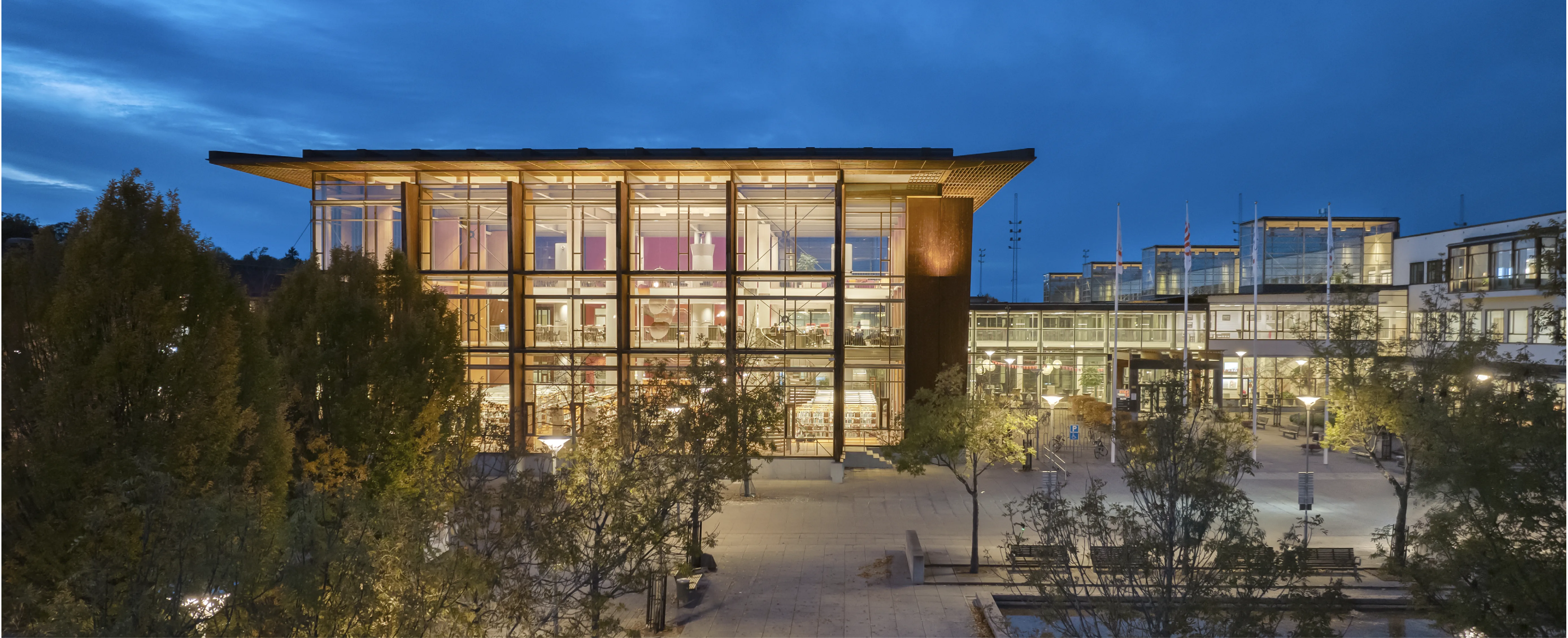 Den nya belysningen har ökat byggnadens synlighet på campusområdet, samtidigt som det varma ljuset nu reflekteras vackert i byggnadens trämaterial.